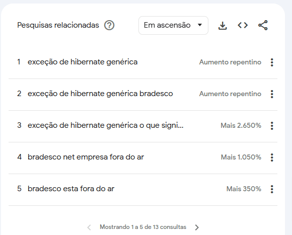 As buscas pelos termos "bradesco fora do ar", "bradesco net empresa fora do ar" e "exceção de hibernate genérica", relacionadas às pesquisas por "bradesco", apresentam um aumento repentino de mais de 350% no Google, em comparação com as últimas 24 horas. Os dados são do Google Trends, ferramenta que exibe os termos mais populares no buscador.